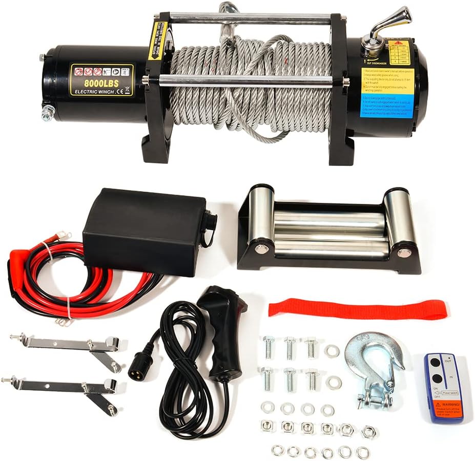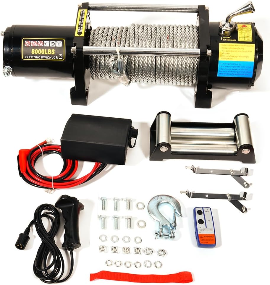 Specification:Rated Line Pull: 8000LBS (3629kgs) single lineMotor: 3.0kw/4.1hp, permanent magnetControl: Remote switch, 9.8ft(3.0m)leadGear train: 3 Stage PlanetaryGear train ratio: 235:1Clutch: Sliding Ring GearBraking Action: Automatic In-The-DrumDrum Size: 2.5"(64)mm”(8.8")233.5mmCable: 8.1mmX27mOverall Dimensions: 19.8"x6.3"x8.5"(503X160X217mm)Mounting Bolt Pattern: 255X114mm Φ11Weight: N.W.33kg G.W.35KgPacking Size: 610x350x270mmLine speed ft/min: 2.9ft/minTotal Rope on Drum :13 feetPackage Including::1 pcs 8000 lbs Electric Winch