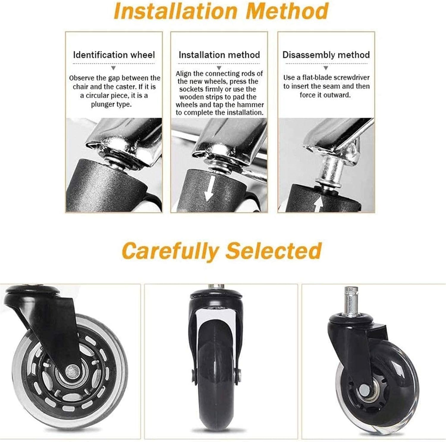 Are you pushing or carrying your equipment from one place to another Don't put pressure on your back and save your energy by installing these new Heavy Duty Castors to your equipment and watch how easy and effortlessly you can manoeuvre your furniture or equipment to your desired location.Have you ever encountered this problem one of your chair casters is damaged or lost but the chair is still very good throwing away is wasteful. Now you can solve this problem with our chair replacement wheel.Product Name: CastersMaterial: PolyurethaneCaster diameter: 75mmCaster height: 95mmMounting rod height: 22mmMounting rod diameter: 11mmLoad capacity: about 250kg / (551lb)Package Content: 5X casters?Universal models: Most of the steering office chairs on the market can be used easy to install and convenient for your use.The casters slide smoothly and quietly so you don't have to worry about disturbing others.360degree rotation easy to convert to any direction you want for your convenience.Wide range of applications: Suitable for most scenes (office school hospital etc.)MONEY BACK GUARANTEE: All castor wheels sets are sold with a 100% money-back guarantee just in case you're not happy with your purchase. Simply get in contact with us and we shall refund you. It's so simple!If you have any questions about the product, please contact us in time, we will reply you within 24 hours.